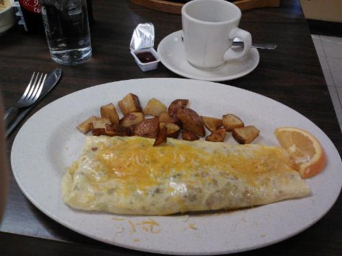 This morning, however, we were there to analyze the breakfast. I ordered the Frank’s Special Omelet, which was a regular omelet with home fries, toast, and orange wedge. I recommend staying away from the Mixed Fruit jelly spread. It was like bubble gum. The other flavors were spreadable. The omelet was good, but too much filling. I gave it a “B.”