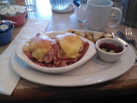 Our next Fast Breaker ordered “Eggs Benedict” served on an English muffin, with tomato and ham accompaniments. The perfectly poached eggs were covered with hollandaise sauce. This entry also included fresh seasoned potatoes and a fruit cup and was also rated “B” because of the large quantity of ham that seemed to over-power the meal.