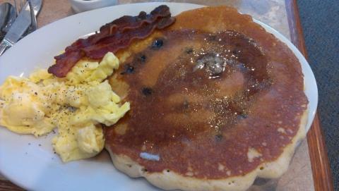 The first Fast Breaker chose “The Tri-Fecta” with two scrambled eggs and a large Blueberry pancake. It was served with both maple and blueberry syrups and thick sliced bacon. This entry was rated “B” because the scrambled eggs were on the dry side.