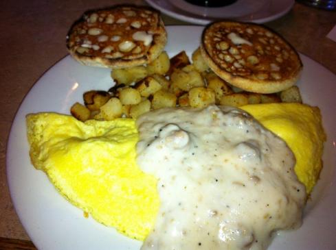 Our last participant ordered “The Gravy Train” omelet filled with bacon, sausage, grilled onions, Cheddar and Monterey Jack cheeses. The omelet arrived covered with Turkey sausage gravy and fresh seasoned potatoes. The entry was prepared and cooked to perfection. It was rated “B+.”