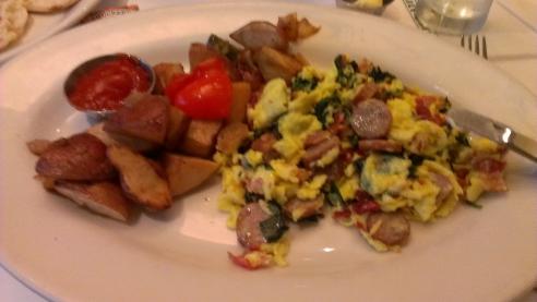 The first clubber ordered Eggs Benedict; two poached eggs on grilled Canadian beacon and toasted English muffins, topped with homemade Hollandaise sauce. It was very good. The second clubber ordered the Protein Scramble; three eggs scrambled with link sausage, beacon, and fresh spinach. His report was favorable. The third clubber went for the Three Eggs; with link sausage. It was good.