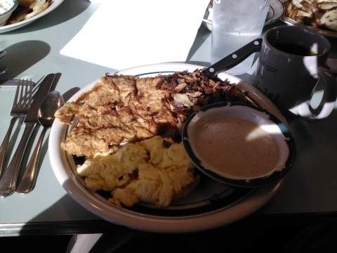 Eggs and chicken fried steak breakfast.