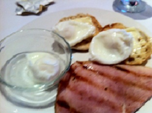 The Chalkboard Breakfast - Three Eggs poached with Country Ham Steak, served with an English Muffin and Hash Browns. Fresh fruit was an alternative to the Hash Browns.