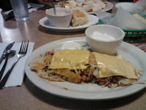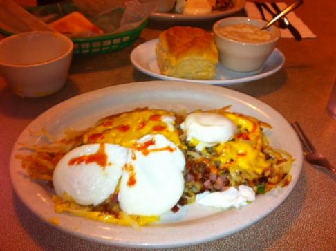 The Fast Breakers each choose the Timmy’s Signature Breakfast. This breakfast comes with a generous helping of hash browns stuffed with ham, sausage, bacon, tomato, and green onions all finely chopped, covered with American cheese. We each selected poached eggs (3) and choice of one with toast and the other enjoyed a biscuit with sausage gravy.