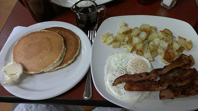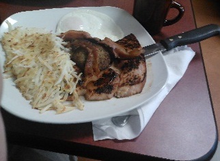 We all happened to select from the “Specialty Breakfast” section. One fast breaker ordered the Mom’s Favorite, which is two eggs any style, 8oz ham steak, two bacon strips, two sausage patties, hash browns, and two slices of buttered toast. It was good. It all came on one of the largest square plates I have ever seen. The ham steak was juicy and flavorful and the eggs tasted extra good for some reason. The sausage patties had an unusual spice mixed into it.
