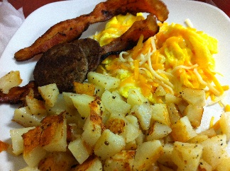 The third clubber ordered the Sampler Scrambled, three scrambled eggs topped with cheddar cheese and served with two sausage patties, two bacon strips, hash browns and a large biscuit with gravy. No complaints from the third clubber.
