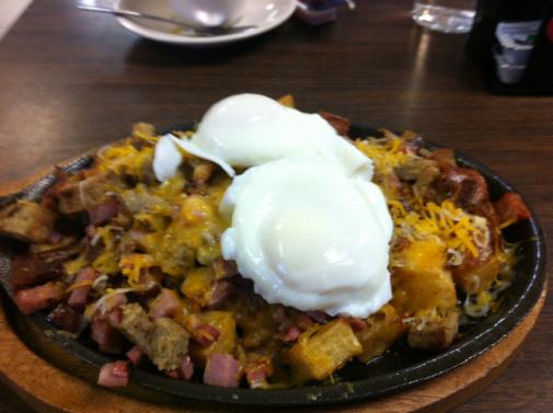 The second clubber ordered Frank’s Popular Skillet. It was a hodgepodge of ham and bacon bits with home fries mixed in and two poached eggs on top with biscuits and gravy on the side. It was served in a little oval shaped iron skillet which was on a little board. He gave it a “C”.