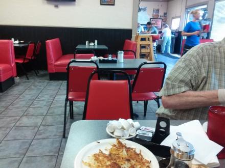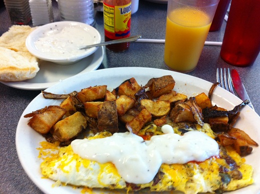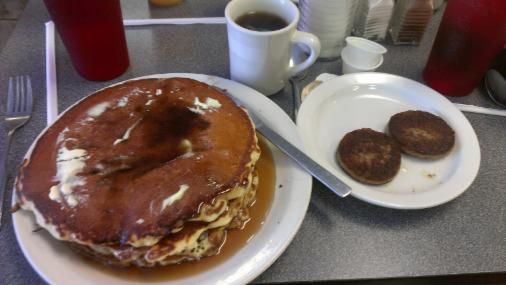 We sampled blueberry pancakes with a side of sausage. The pancakes were cooked to perfection with lots of fresh blueberries. The sausage patties had a dry mealy taste. Another member opted for two eggs, two bacon strips, two sausage patties, along with pancakes (with extra syrup) and a side of home fried potatoes. The verdict, very, very good. Our third member ordered the three meat omelet with ham, sausage, bacon, topped with cheese and offered with breakfast potatoes and a biscuit with homemade gravy. The omelet was light and fluffy, and prepared so that the ingredients blended together for a great taste.
