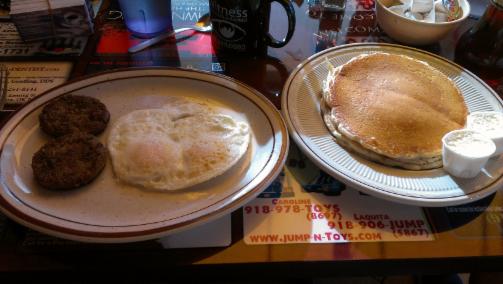 Each of our trio was pleased with their order. The most glowing review came from the clubber who dined on the Cinnamon Roll Pancake. With its frosting drizzle there is no need for syrup. The Eggs Benedict also earned high marks. A unique feature of the Eggs Benedict is that the order is served on a biscuit and not an English muffin. Our third member who boasts seven grandchildren thought it was only right for him to order the Grandpa's Special. It comes with two pancakes, two eggs, and he ordered sausage. The pancakes were fluffy and sweet. The sausage was a bit too mild.