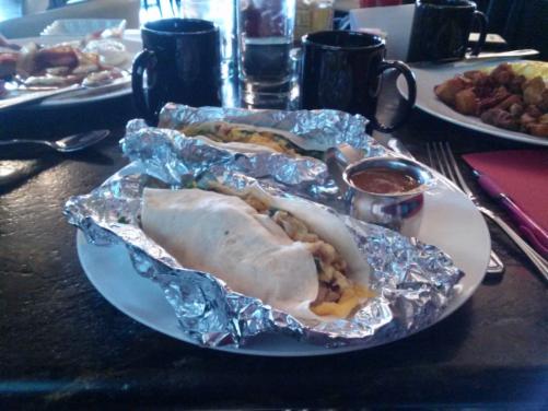 The second breaker went for the chef’s choice of the day, the Breakfast Taco. It was similar to a burrito filled with taco veggies and came with a very good salsa. The only problem was that it was a soft shell taco wrapped in foil. Wrapping it made the shell soggy and eating it became a problem.