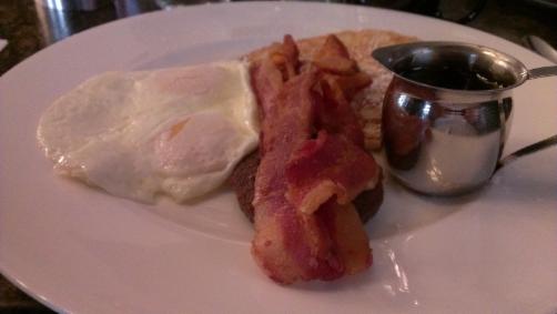 One of the breakers ordered the American Hero, two eggs, bacon, sausage, and one pancake. He had eggs over easy. They were nicely cooked. It came with several slices of bacon and one sausage patty. The pancake came with a three inch square patty of butter and was unusually tasty, with a hint of tartness. Unfortunately, the waitress was clueless as to how it was made and she was not interested in the mystery of it all. It was obvious she didn’t know who we were. Anyway, they also served Topeca Coffee which is a local favorite.