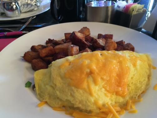 The third faster ordered the Chef’s Omelet of the Day. It was an artistic selection of seasonal ingredients in a three egg omelet served with breakfast potatoes. He also ordered a small V-8. The salt and pepper were in odd shaped silver shakers, but fit together. We all felt the food was good, but there was an impediment which caused it to cool. We gave it a “B.”