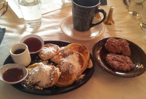 Sears Swedish Pan Cakes served with outstanding favorable maple syrup, peach preserves and covered with powdered sugar. This dish will satisfy your sweet tooth!