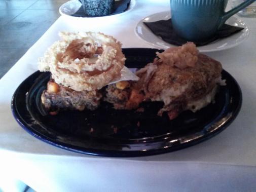 Smoked Akaushi Short Rib Hash has a bizarre name, but it is just what it says it is. Akaushi is one of the four breeds of “Kobe Beef” cattle. It was pulled and lightly bar-b-queued into a delicious hash which formed the base for the one egg to rest. The hash-browns were equally as tasty with a small portion of baked apple on top. Three delicately fried onion rings topped the dish. Very good.
