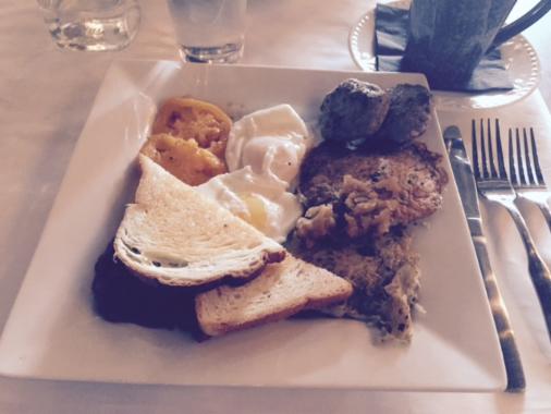 English breakfast included banger sausage, hash browned latke, lightly seasoned potato pan cakes, a grilled tomato slice and traditional baked beans with just a hint of spice. All topped off with two poached eggs. An interesting combination of flavors that was most satisfying.