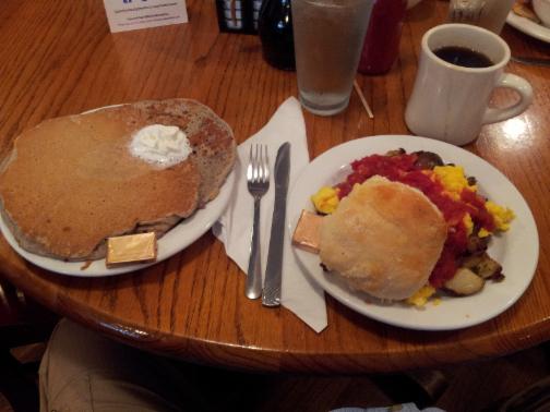 The clubber on the trip ordered the Red Earth plate. It was a mound of potatoes, scrambled eggs, and topped with salsa. It was huge and delicious. The three shared a single buckwheat pancake that draped over the edge of the plate.