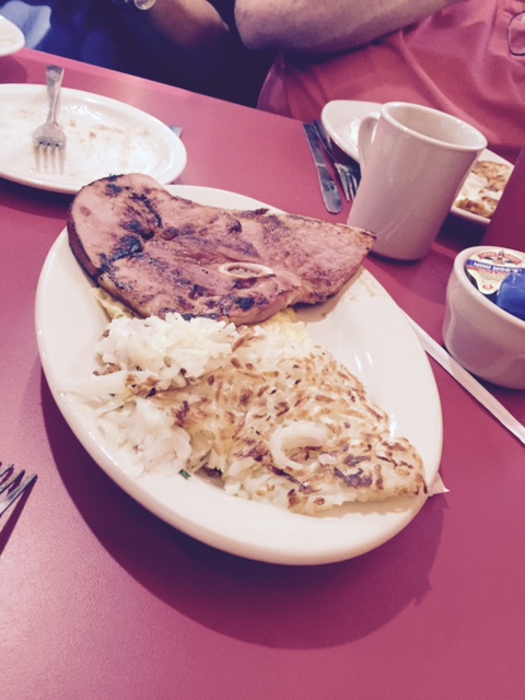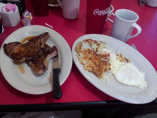 One breaker ordered the Ham Steak and Eggs. It was a large thick slab of country ham blazed on the griddle, two eggs, and hash browns. It took three plates to serve it.