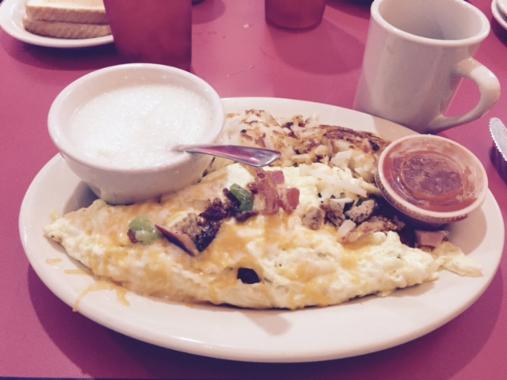 The fourth breaker ordered the Oklahoma Omelet. Bacon, sausage, shredded beef and ham with fresh green peppers, onions and Cheddar cheese, served with the house salsa.