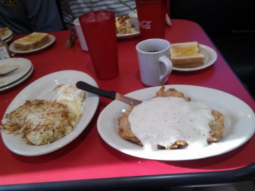 The third breaker ordered the Chicken Fried Steak and Eggs. Tender USDA Choice round steak, hand breaded then golden-fried with two eggs and hash browns.