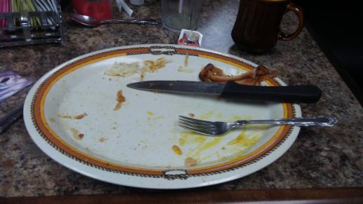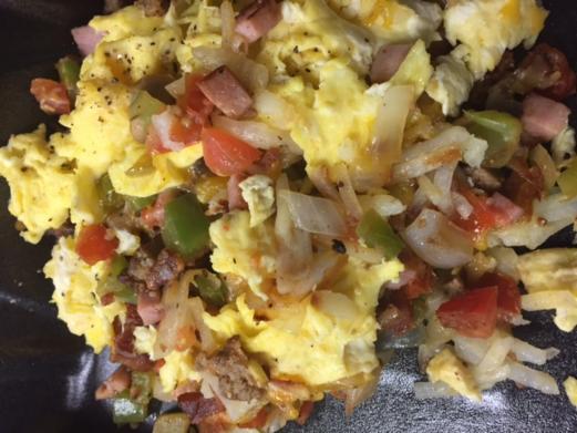 The third breaker had the Meat Lovers Omelette. It is a Skillet dish with 2 eggs scrambled and heaping portions of Cheddar and Jack cheese, diced country ham, bacon, sausage, mushrooms, onions, and green peppers. He said it was delicious.